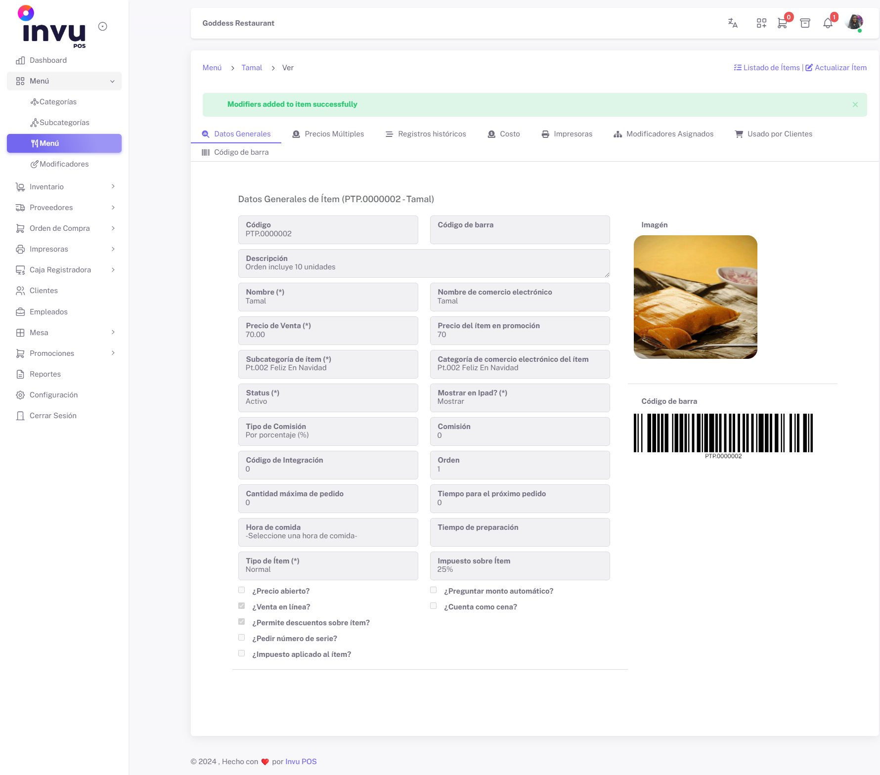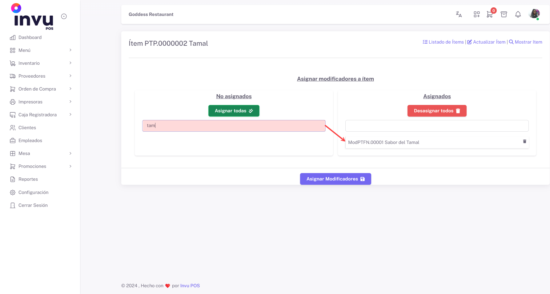 - Confirmación de Asignación: Una vez seleccionados los modificadores que desea asignar, presione el botón Asignar Modificadores. La pantalla regresará automáticamente a la vista general de los datos del ítem.