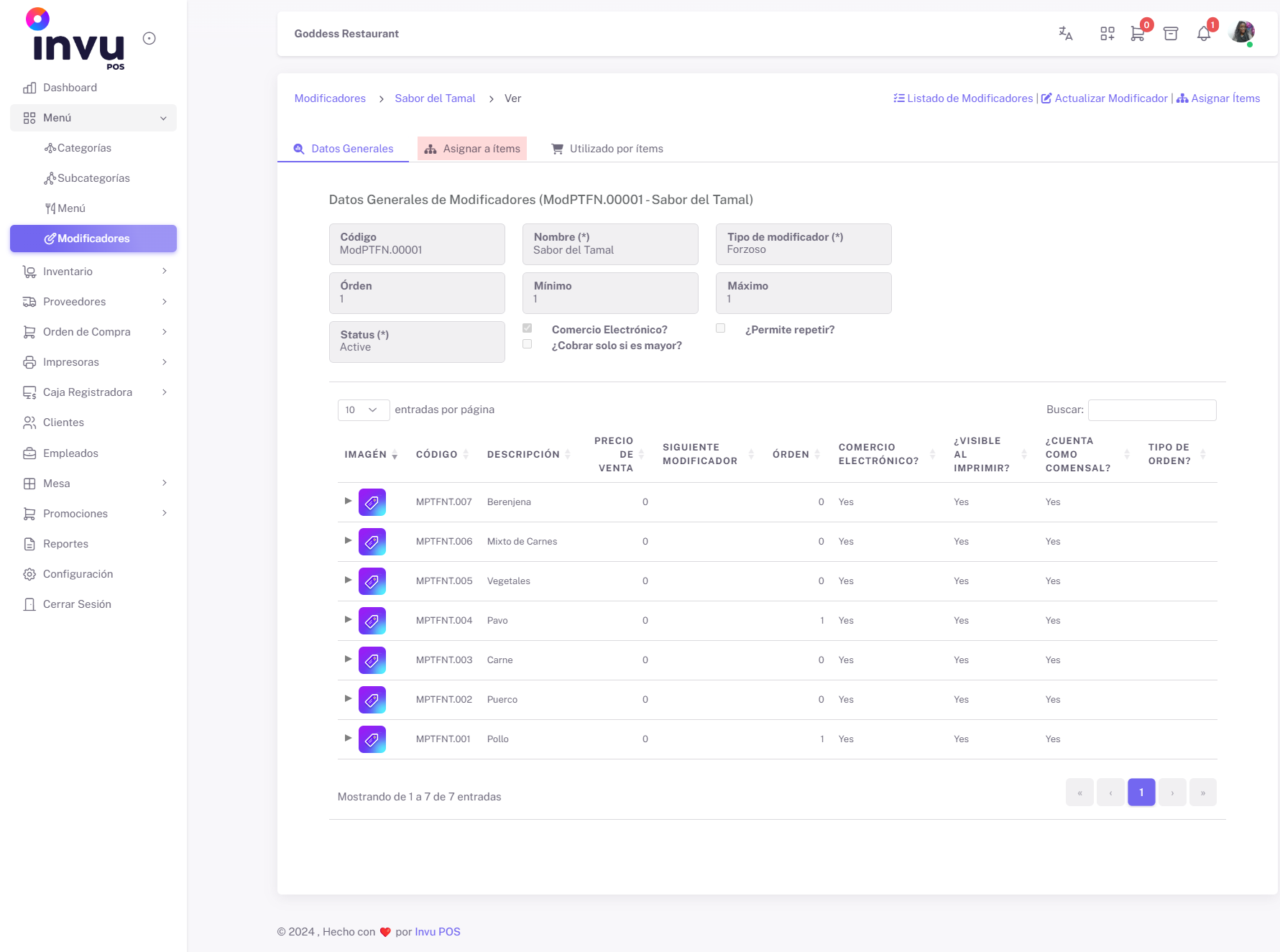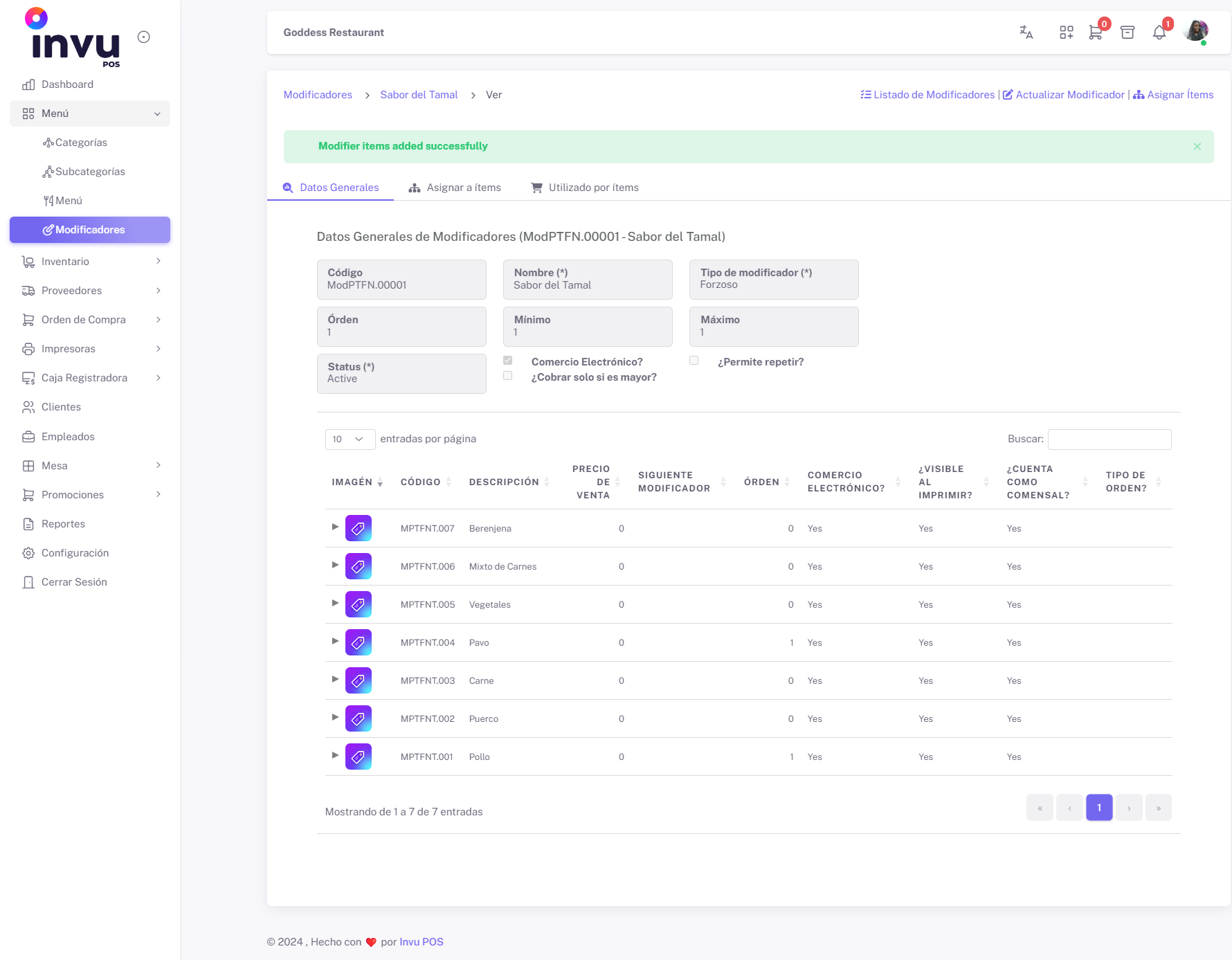- Confirmación de Asignación: Una vez seleccionados los ítems que desea asignar al modificador, presione el botón Asignar Ítems. La pantalla regresará automáticamente a la vista general de los datos del modificador.